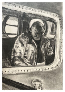 recently Ros has had a very successful solo exhibition at Oriel y Parc showing her charcoal drawings of the local lifeboat team and wonderful canvases worked up in situ on the beach..