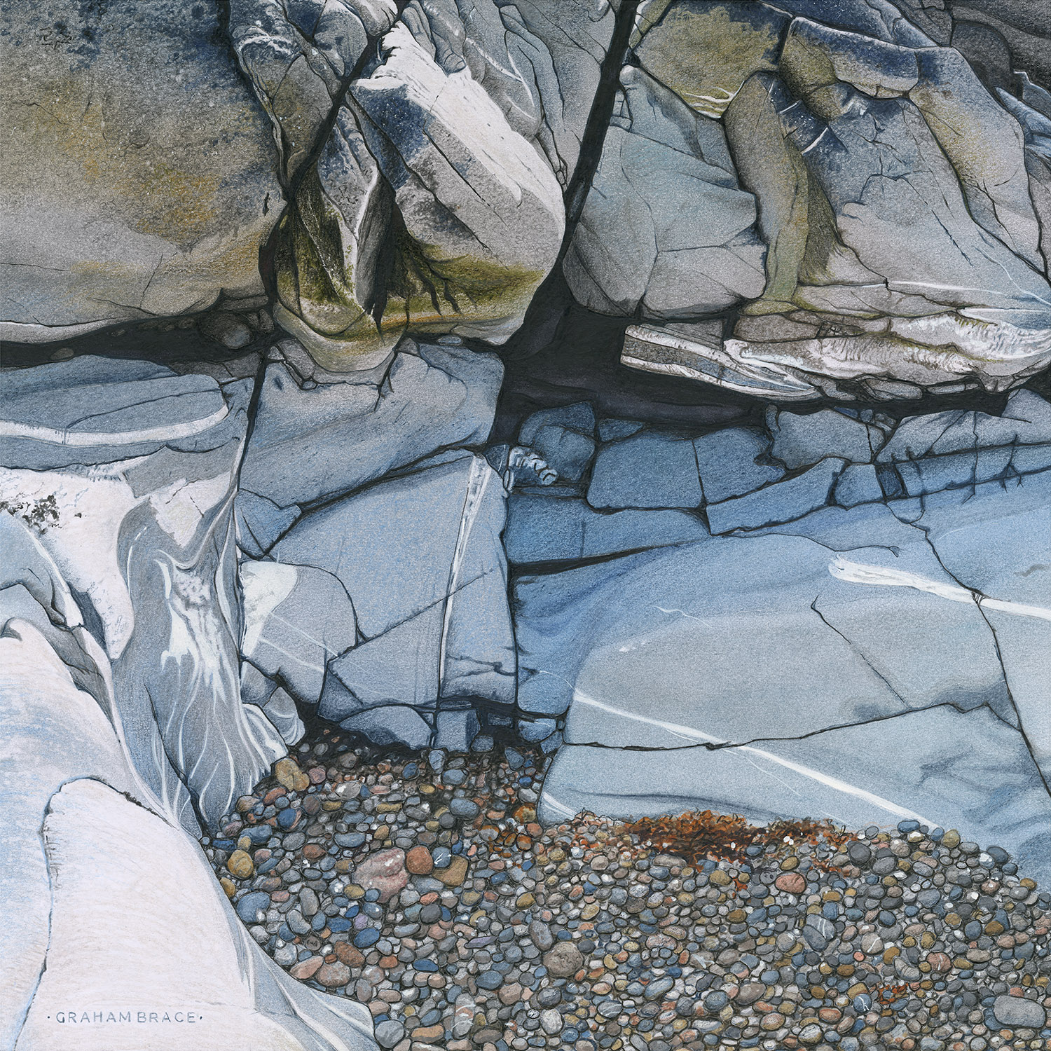 Graham is a highly accomplished Pembrokeshire artist who is renowned for his skills with coloured pencils which he often supplements with soft pastels, gouache, markers and pens. On our website we are showing a selection of his beautiful compositions drawn from local geological subjects.