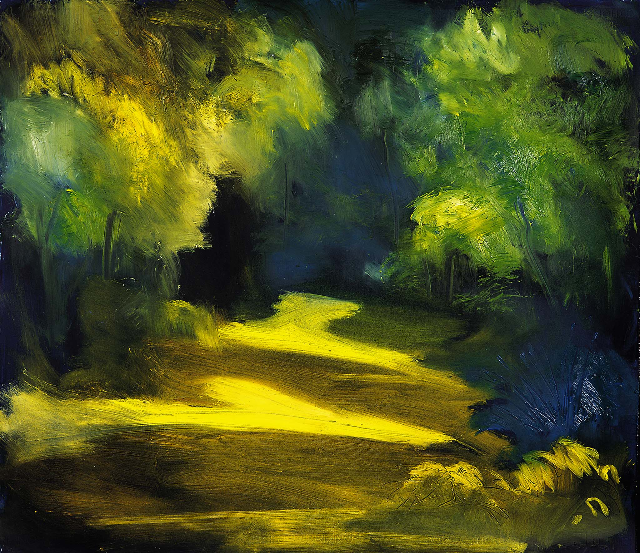 Mixed Media painting.  A layered woodland path in deep greens, offering a quieter, more reflective scene.  Green Path reveals a more contemplative side of Daniels’ work. Subtle tonal shifts and layered colour create depth, inviting the viewer into a calmer, more introspective landscape.