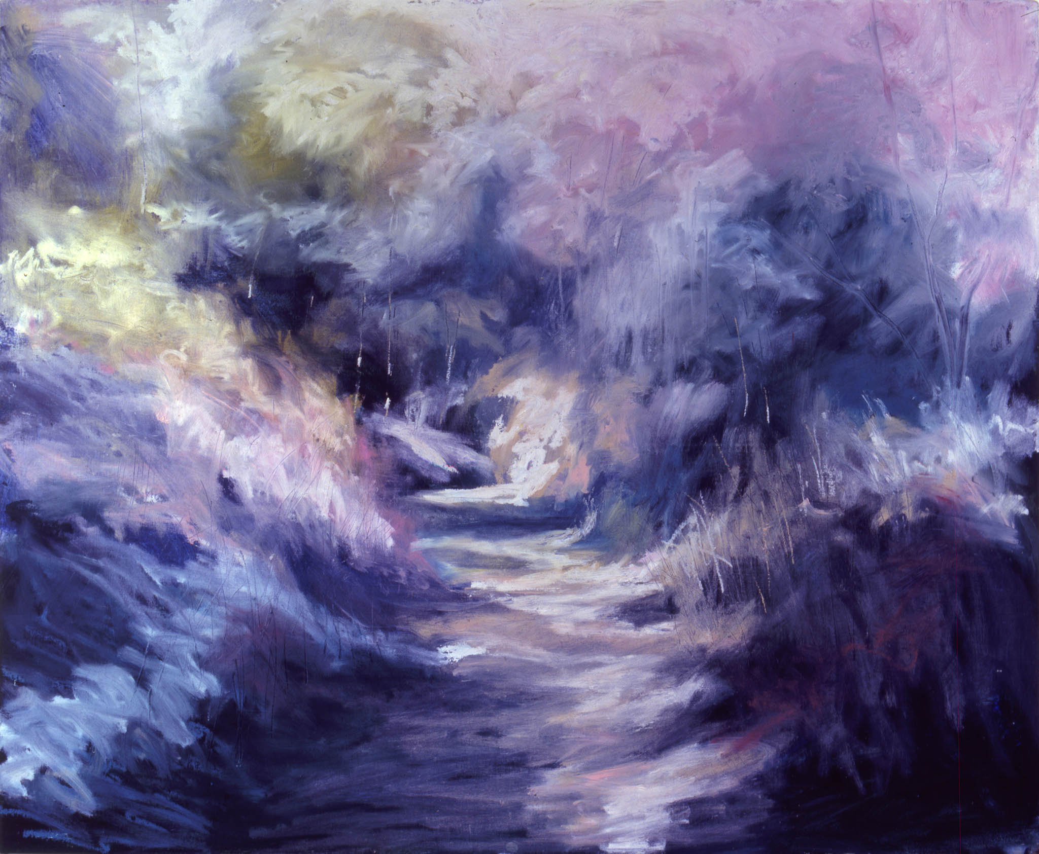 Mixed Media painting.  A richly layered scene, full of texture and movement.