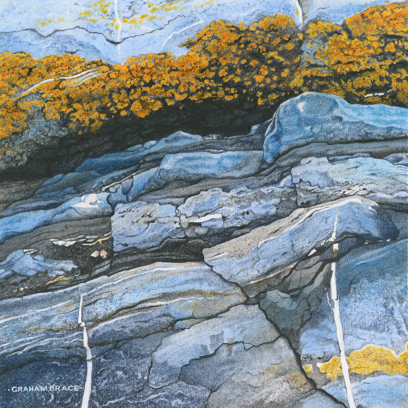 Graham is a highly accomplished Pembrokeshire artist who is renowned for his skills with coloured pencils which he often supplements with soft pastels, gouache, markers and pens.  On our website we are showing a selection of his beautiful compositions drawn from local geological subjects.