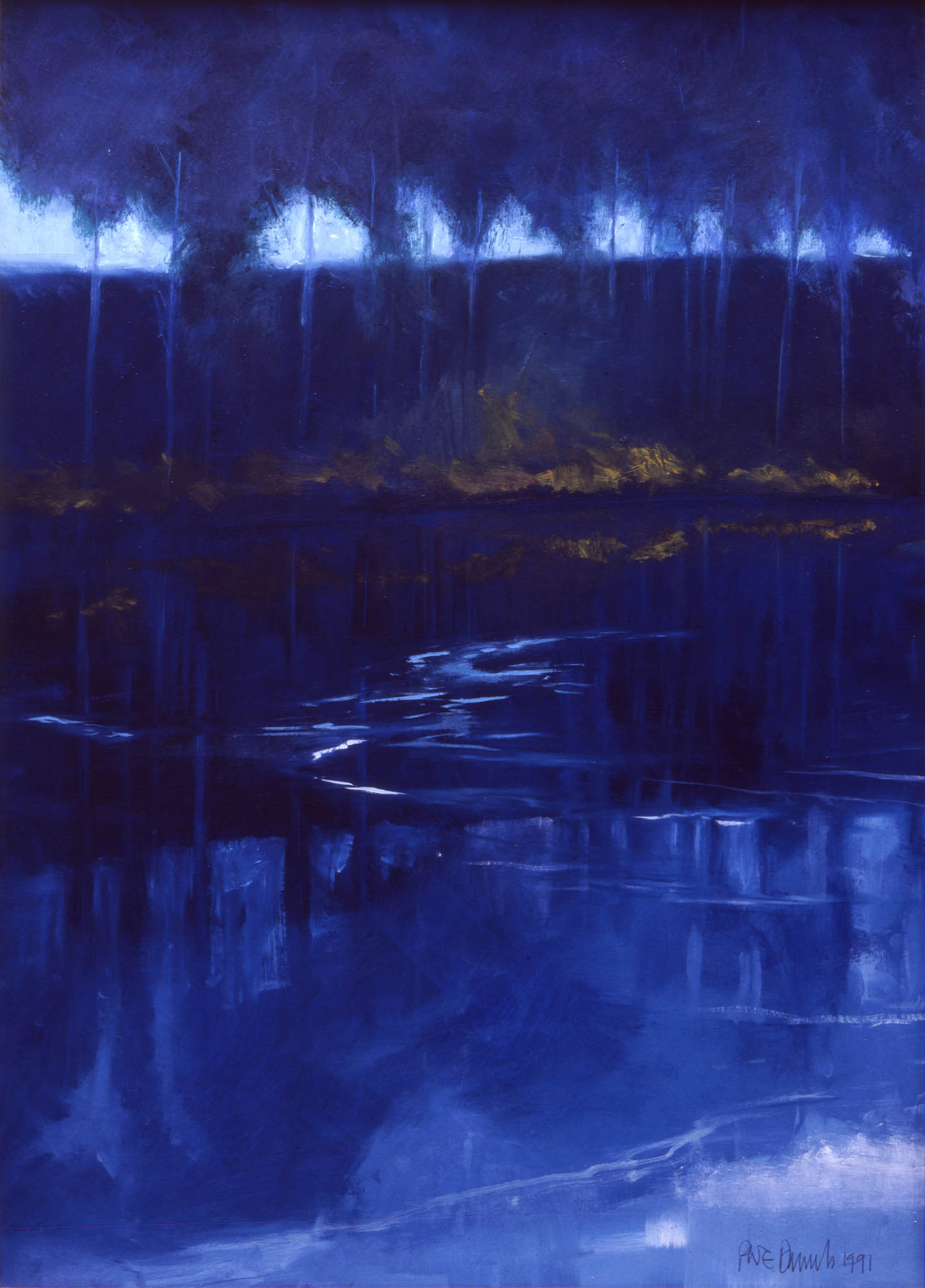Mixed Media painting. A calm, atmospheric scene in deep blues, capturing stillness at dusk.